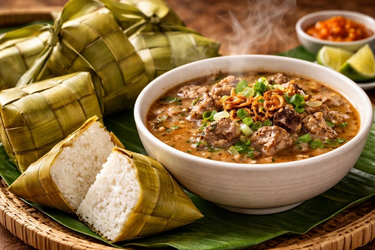 BONE, BONETERKINI.ID – Menikmati semangkuk Coto Makassar yang hangat dengan kuah kacang yang kental adalah sebuah kemewahan rasa. Namun, bagi sebagian besar masyarakat di Sulawesi, ritual makan ini dianggap belum tuntas jika tidak didampingi oleh ketupat daun pandan. Ada sebuah ikatan rasa yang unik yang membuat keduanya saling melengkapi.